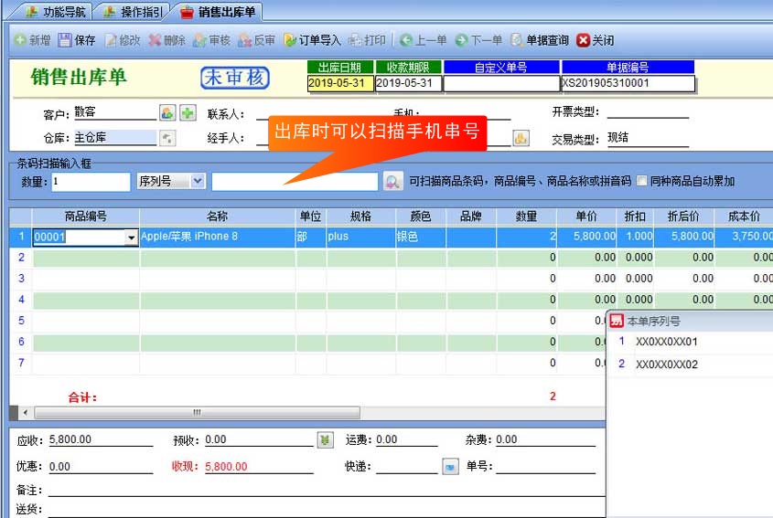 然后銷售的時候,可以直接在條碼框中掃描序列號(串號)直接調(diào)出該商品,也可以在這一行上右鍵,序列號,選擇對應(yīng)的序列號進行銷售。