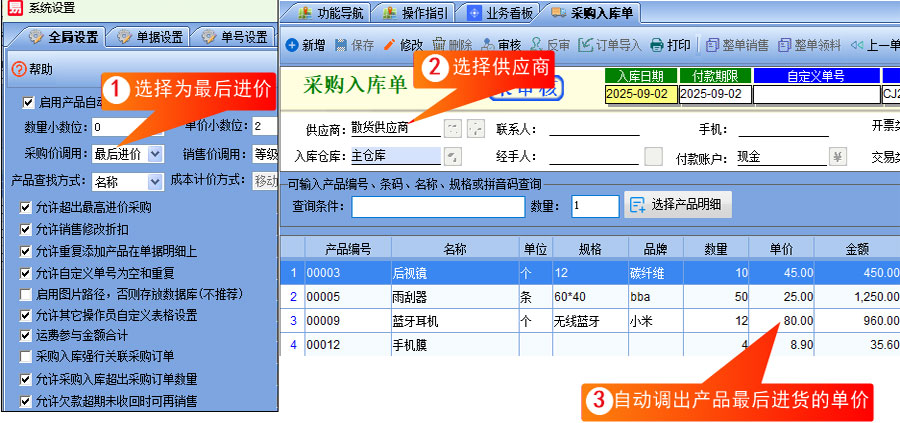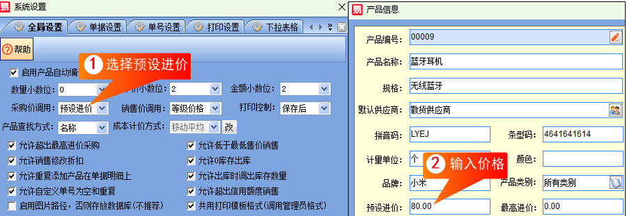 采購(gòu)價(jià)自動(dòng)調(diào)用包含有兩種方式,一個(gè)是預(yù)設(shè)進(jìn)價(jià),另一個(gè)是最后進(jìn)價(jià)。