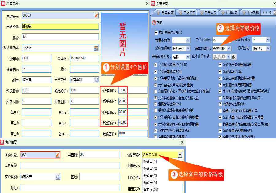 一、當(dāng)【系統(tǒng)設(shè)置】中的【銷售價(jià)調(diào)用】選擇為【等級(jí)價(jià)格】時(shí),在【產(chǎn)品資料】窗口,可以分別輸入4個(gè)不同的【預(yù)設(shè)售價(jià)】。對(duì)應(yīng)客戶資料里面的四個(gè)價(jià)格等級(jí),可以設(shè)置不同的客戶價(jià)格等級(jí),分別調(diào)用對(duì)應(yīng)的預(yù)設(shè)售價(jià)進(jìn)行銷售開(kāi)單。