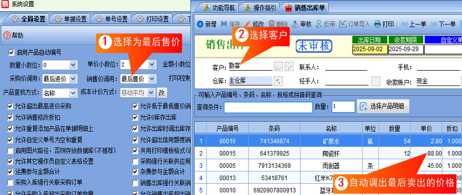 二、在【系統(tǒng)設(shè)置】中的【銷售價(jià)調(diào)用】選擇為【最后售價(jià)】時(shí),進(jìn)行銷售開(kāi)單時(shí),系統(tǒng)自動(dòng)查詢同一個(gè)客戶同一個(gè)產(chǎn)品最后一次賣(mài)出的價(jià)格進(jìn)行調(diào)用。