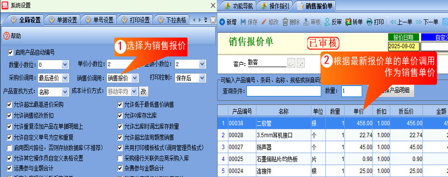 三、在【系統(tǒng)設(shè)置】中的【銷售價(jià)調(diào)用】選擇為【銷售報(bào)價(jià)】時(shí),通過(guò)前面錄入過(guò)的銷售報(bào)價(jià)單存檔,自動(dòng)調(diào)用最新報(bào)價(jià)單中的價(jià)格進(jìn)行銷售開(kāi)單。