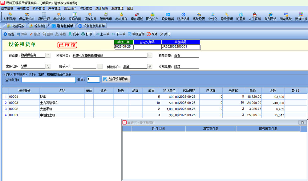 通過(guò)設(shè)備租賃單,可以記錄租賃的機(jī)器設(shè)備數(shù)量,以及租賃單價(jià)、租賃的起始日期等,軟件會(huì)自動(dòng)計(jì)算出租賃金額。如果有提前預(yù)付的定金,也可以一起記錄進(jìn)來(lái),后期進(jìn)行租賃結(jié)算時(shí),可直接抵扣結(jié)算。同時(shí),在進(jìn)行設(shè)備租賃之前,雙方所簽訂的合同條約等文件,可以直接上傳到對(duì)應(yīng)的設(shè)備租賃單中,作為單據(jù)的附屬文件。可以隨時(shí)下載文件,便于后期的資料整理等工作順利開展。當(dāng)自有的機(jī)器設(shè)備租賃出去。后期進(jìn)行設(shè)備歸還時(shí),易特工程項(xiàng)目管理軟件,還可以制作設(shè)備租賃結(jié)算單。記錄租賃的結(jié)束日期,系統(tǒng)會(huì)根據(jù)租賃單上的起始日期,自動(dòng)計(jì)算中間的租用天數(shù),以及相應(yīng)的金額等。