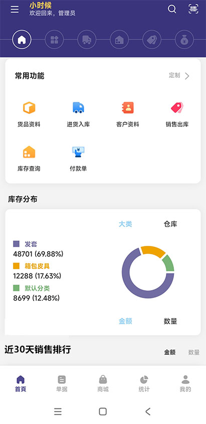 管家通進銷存軟件擁有庫位、色號等功能特性,適合汽配、陶瓷、五金等商貿(mào)企業(yè)的出入庫管理,滿足這些行業(yè)的指定需求。支持手機、電腦、PDA不同設備的使用,適應不同的使用場景。手機端功能強大靈活,可以輕松實現(xiàn)條碼掃描出入庫,倉庫內(nèi)盤點。還可隨時開展在外的業(yè)務,進行開單銷售??梢愿鶕?jù)不同的用戶對象,分別設置使用權(quán)限。手機端還可以直接查看每日的經(jīng)營概況,如銷售單數(shù)、銷售金額、銷售利潤等,提供數(shù)據(jù)性支持,輔助管理員更好的決策公司業(yè)務發(fā)展方向。
