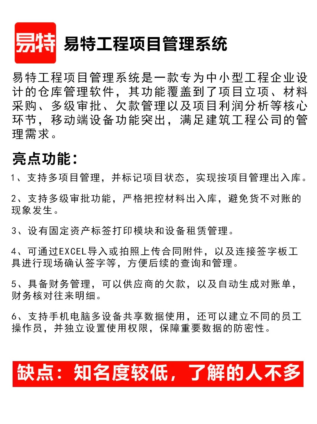 易特工程項目管理系統(tǒng)是一-款專為中小型工程企業(yè)設計的倉庫管理軟件,其功能覆蓋到了項目立項、材料采購、多級審批、欠款管理以及項目利潤分析等核心環(huán)節(jié)。移動端設備功能突出,滿足建筑工程公司的管理需求。
