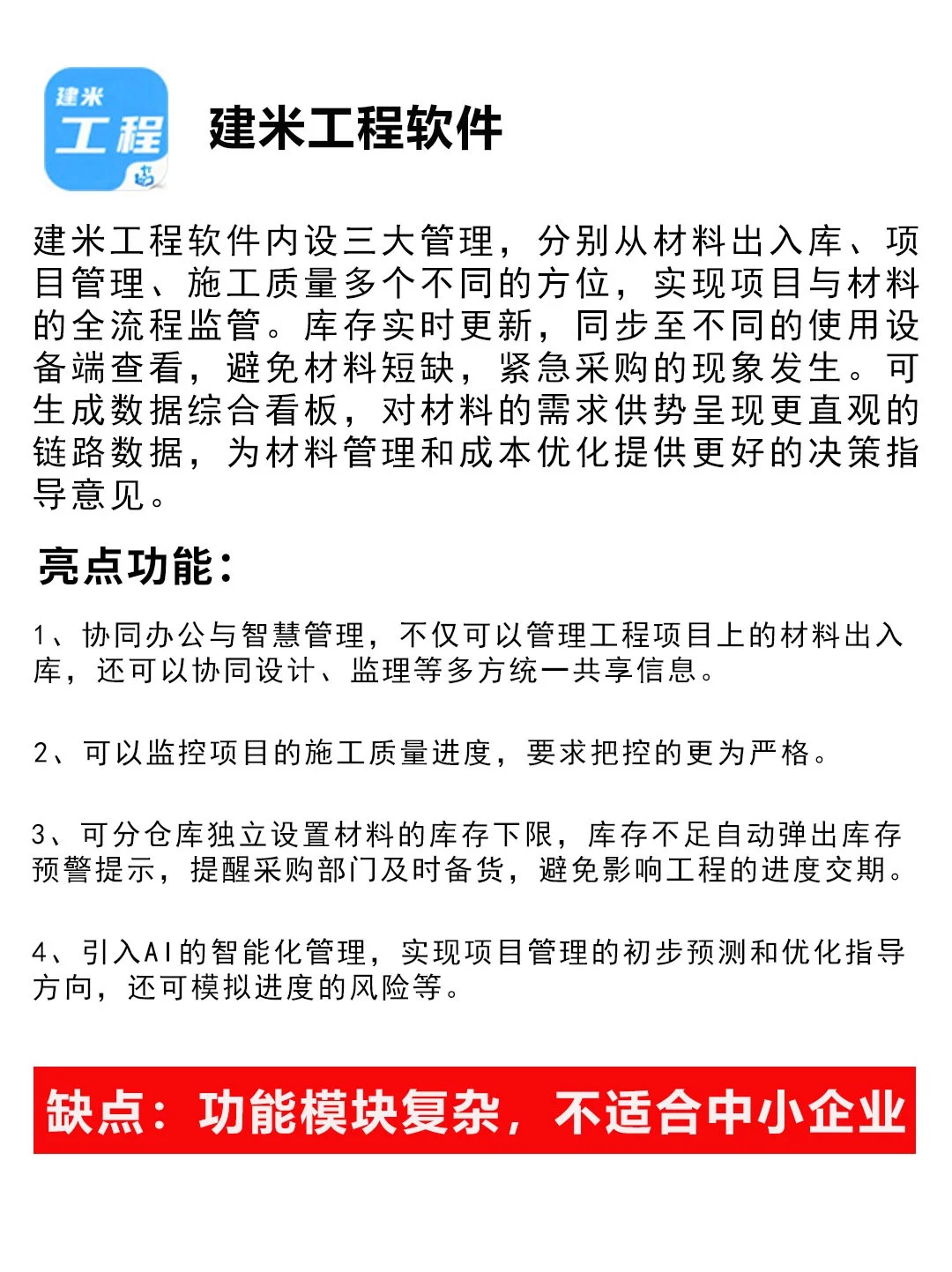 建米工程軟件內(nèi)設三大管理,分別從材料出入庫、項目管理、施工質(zhì)量多個不同的方位,實現(xiàn)項目與材料的全流程監(jiān)管。庫存實時更新,同步至不同的使用設備端查看,避免材料短缺,緊急采購的現(xiàn)象發(fā)生。可生成數(shù)據(jù)綜合看板,對材料的需求供勢呈現(xiàn)更直觀的鏈路數(shù)據(jù),為材料管理和成本優(yōu)化提供更好的決策指導意見。