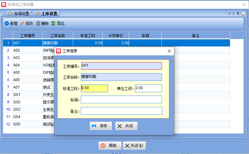 一、【基本信息】-【車間與工序設(shè)置】,打開如下圖,在工序設(shè)置中設(shè)置好所有的工序。