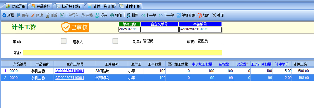 九、【生產(chǎn)管理】-【計(jì)件工資查詢】可以看到掃碼報(bào)工轉(zhuǎn)入進(jìn)來的計(jì)件工資,可以對報(bào)工的內(nèi)容再進(jìn)行修改,數(shù)量,計(jì)件單價(jià)都可以修改,最終審核以后