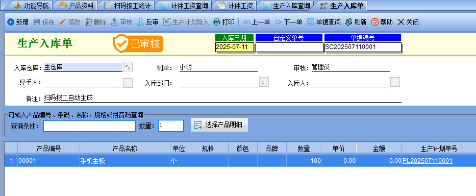 八、【生產(chǎn)管理】-【生產(chǎn)入庫查詢】如果設(shè)置了報(bào)工完成后自動生成成品入庫單,則最后一個(gè)工序完工后,自動生成一張生產(chǎn)入庫單,打開審核后則增加成品的庫存。