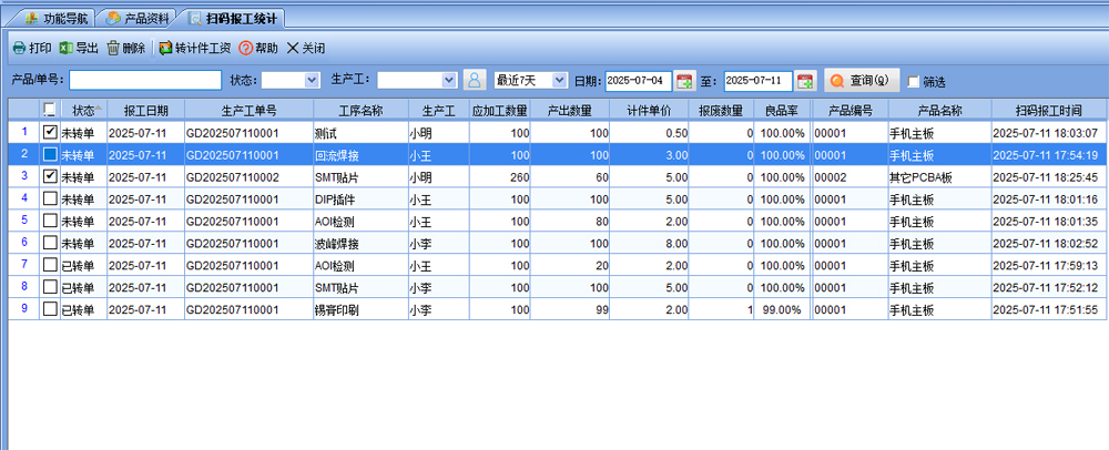 七、【生產(chǎn)管理】-【掃碼報(bào)工統(tǒng)計(jì)】可以看到掃碼報(bào)工的明細(xì),可以選擇某個(gè)員工的查詢,最后打勾,點(diǎn)擊【轉(zhuǎn)計(jì)件工資】則生成計(jì)件工資單,