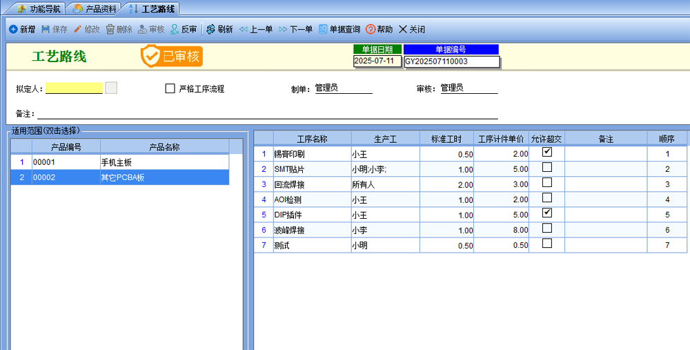 三、【生產(chǎn)管理】-【工藝路線】,設(shè)置好工藝路線,如果有多個(gè)產(chǎn)品的工序相同,則左邊可以選擇多個(gè)產(chǎn)品,右邊選擇好工序,可以指定好生產(chǎn)工和工序單價(jià),