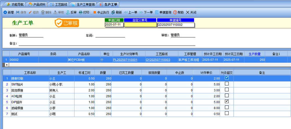 四、【生產(chǎn)管理】-【生產(chǎn)工單】,可以手動創(chuàng)建一個(gè)工單,選擇產(chǎn)品后,自動根據(jù)當(dāng)前產(chǎn)品的工藝路線帶出工序,也可以手動修改工序及生產(chǎn)工和各項(xiàng)參數(shù)。