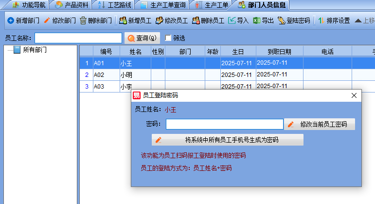 五、【基本信息】-【部門人員信息】,給員工設(shè)置一個(gè)登陸密碼,也可以一鍵將所有的員工手機(jī)號生成為登陸密碼。