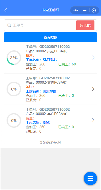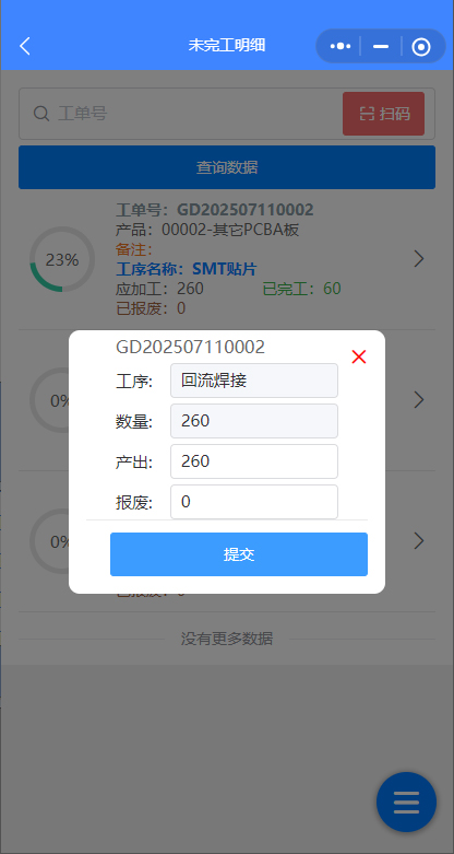點(diǎn)擊某個(gè)工序后,直接填上產(chǎn)出數(shù)量與報(bào)廢數(shù)量,如果為嚴(yán)格工序流程控制,工單數(shù)量100,如上個(gè)工序總的產(chǎn)出數(shù)為99,報(bào)廢數(shù)為1,
