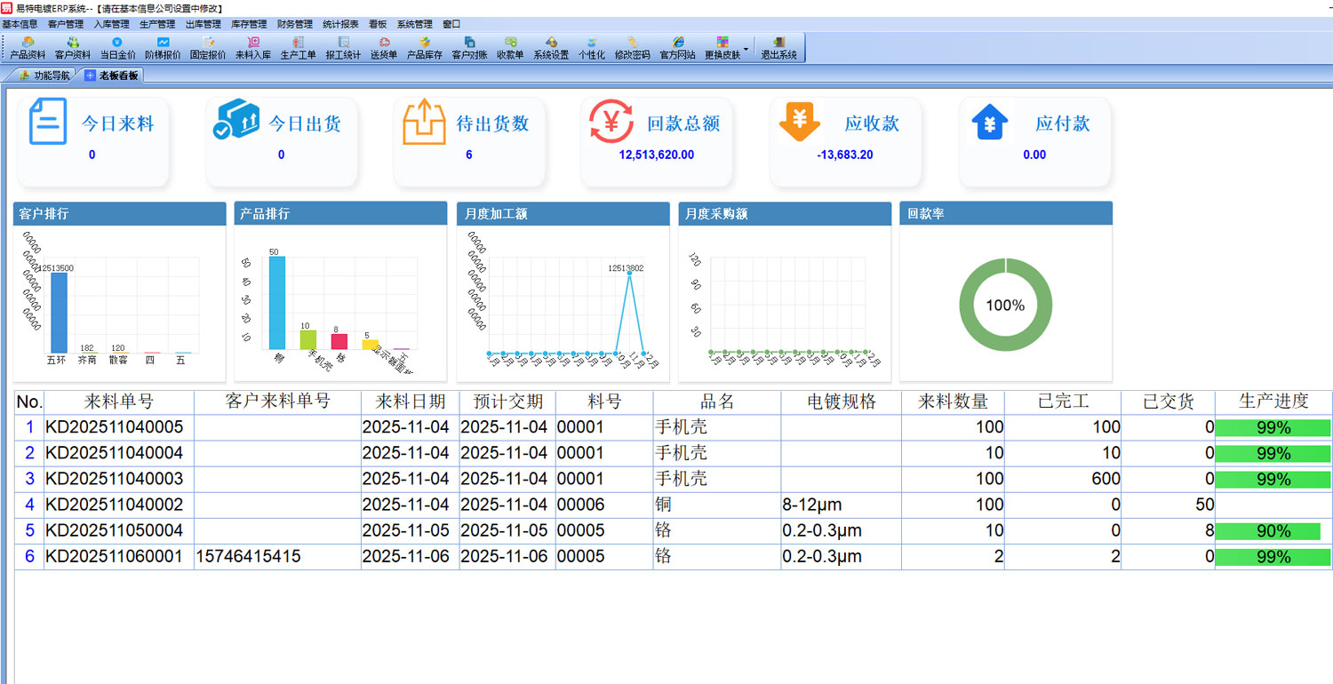 除了對生產(chǎn)過程的智能管控,易特電鍍ERP系統(tǒng),還能對產(chǎn)品、客戶、供應(yīng)商、部門、員工等基礎(chǔ)的信息集中錄入,統(tǒng)一管理維護(hù),確保數(shù)據(jù)的準(zhǔn)確性,便于查詢使用。此外還擁有財(cái)務(wù)管理,可以管理供應(yīng)商和客戶欠款,自動(dòng)生成對賬單做收付欠款處理等。同時(shí)還擁有老板看板、生產(chǎn)看板兩大重要的數(shù)據(jù)看板。通過看板的呈現(xiàn),將系統(tǒng)各處的數(shù)據(jù)集中顯示,實(shí)現(xiàn)數(shù)據(jù)可視化,可以輔助決策等。