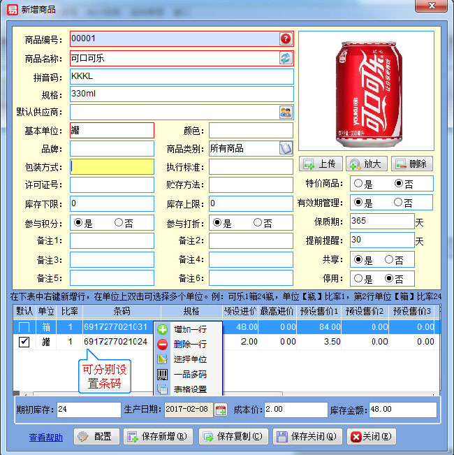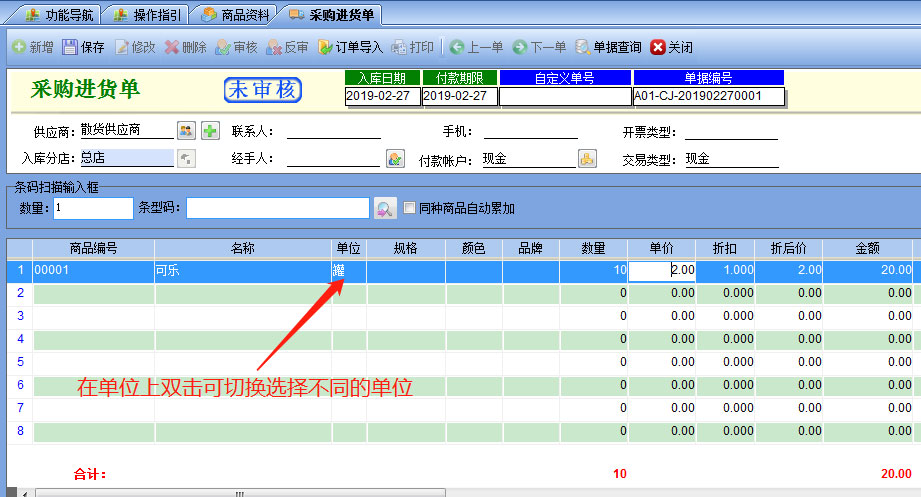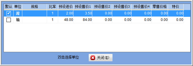 選擇好基本單位【罐】下圖表格是自動增加一行單位為【罐】的默認單位,可設(shè)置罐裝的條碼及售價信息,然后在表格上右鍵【增加一行】然后在單位上雙擊,則彈出選擇不同的單位,如果這里沒有單位,可以從【基本信息】---【綜合設(shè)置】中添加常用的商品單位采購進貨開單時調(diào)出商品后,也可以在單位上雙擊進行不同的單位選擇,也可以直接掃描對應的條碼自動調(diào)出不同的單位。