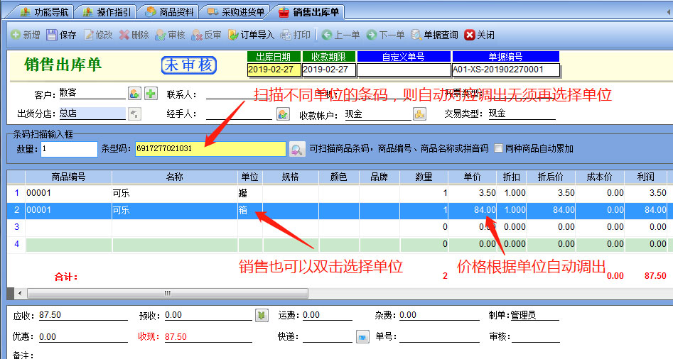 銷售出庫時,可以直接掃描具體的條碼,比如一箱的條碼,或是單件的條碼,自動帶出對應的商品單位,輸入數(shù)量以后,庫存自動換算