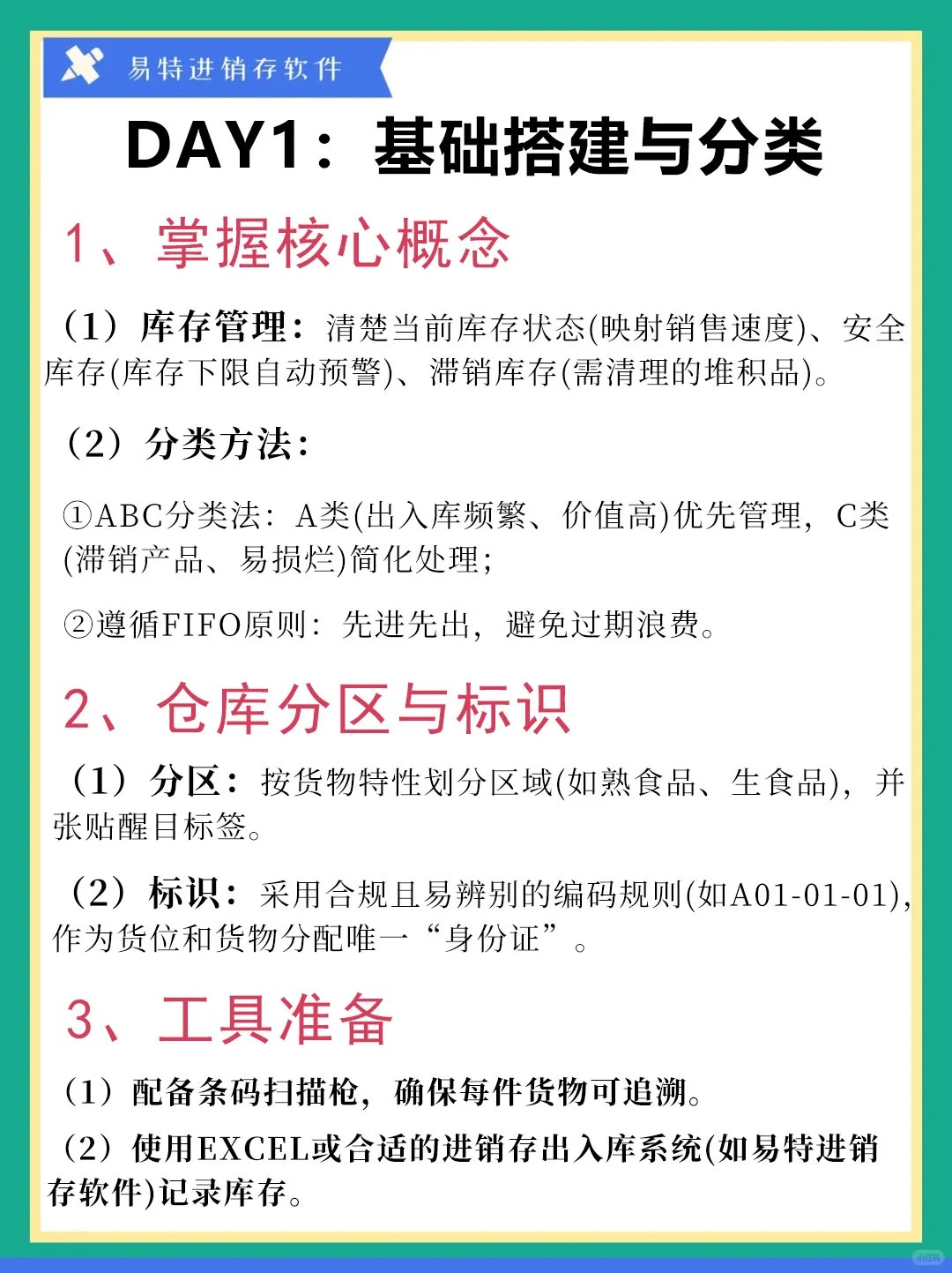 (1)ABC分類法:A類(出入庫頻繁、價值高)優(yōu)先管理,C類(滯銷產品、易損爛)簡化處理。