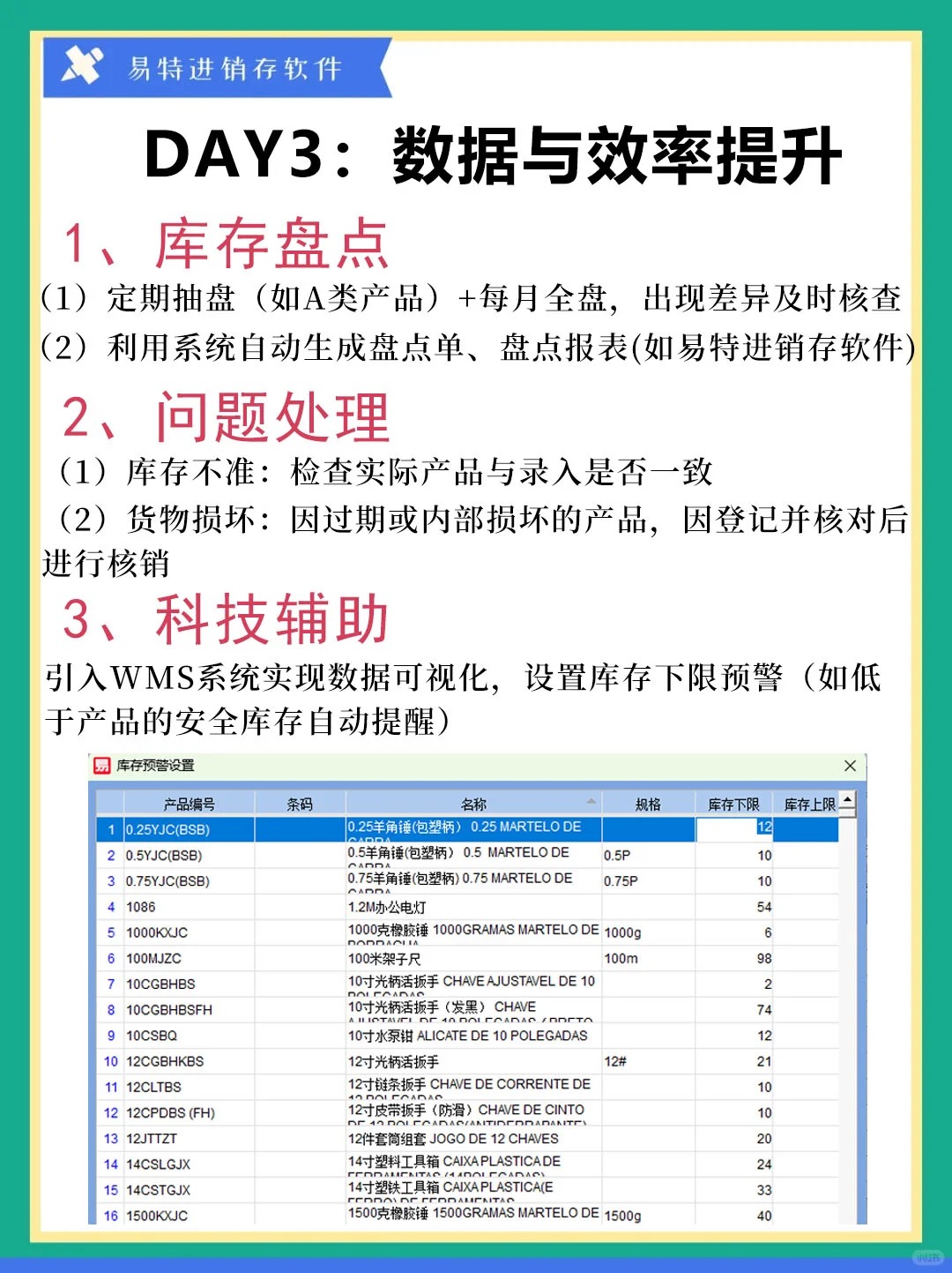 3、科技輔助:引入WMS系統(tǒng)實現(xiàn)數(shù)據(jù)可視化,設置庫存下限預警(如低于產品的安全庫存自動提醒)