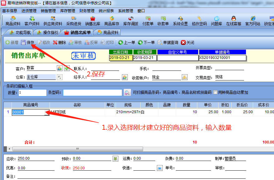 點(diǎn)擊工具欄上的【銷售出庫】,在商品編號(hào)欄選擇之前創(chuàng)建的產(chǎn)品,輸入數(shù)量后點(diǎn)擊【保存】。然后點(diǎn)擊【打印】。