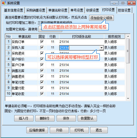 打開(kāi)易特軟件后【系統(tǒng)管理】----【系統(tǒng)設(shè)置】-----【打印設(shè)置】,點(diǎn)擊添加自定義紙張(不支持共享打印機(jī)添加,需要在安裝打印機(jī)的電腦上操作,因?yàn)槭侵苯有薷拇蛴C(jī)驅(qū)動(dòng),共享無(wú)權(quán)修改),會(huì)自動(dòng)添加上兩種常用的規(guī)格,21X14,21X9,每個(gè)單據(jù)可以選不同的紙型打印