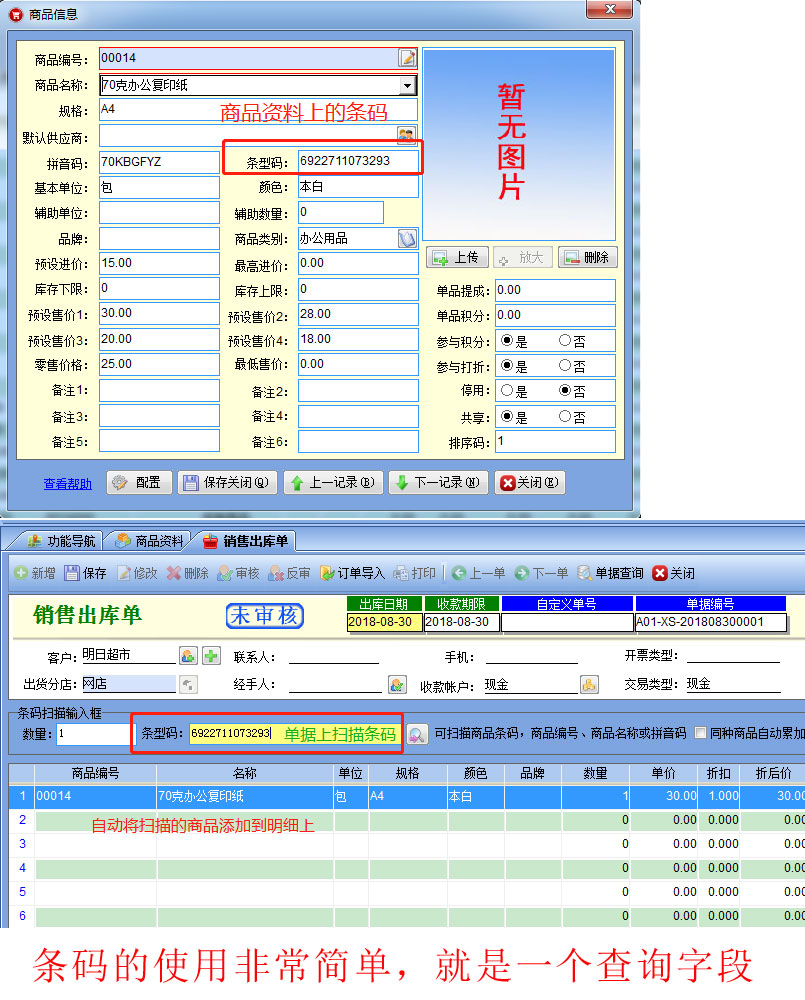 3.開單時(shí)將光標(biāo)定位在【條型碼】框里面然后掃描條碼就能自動(dòng)查詢到該條碼對應(yīng)的產(chǎn)品,而不易出錯(cuò),迅速,高效率的開單。