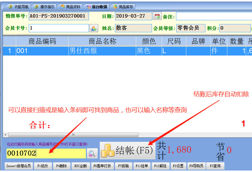 三、如果有顧客來買衣服了,可以用[前臺收銀]功能直接銷售,銷售后庫存數(shù)量自動(dòng)減少,同時(shí)可以給顧客積分等。