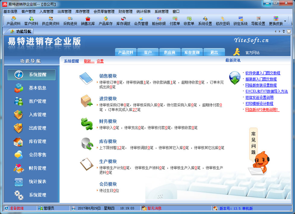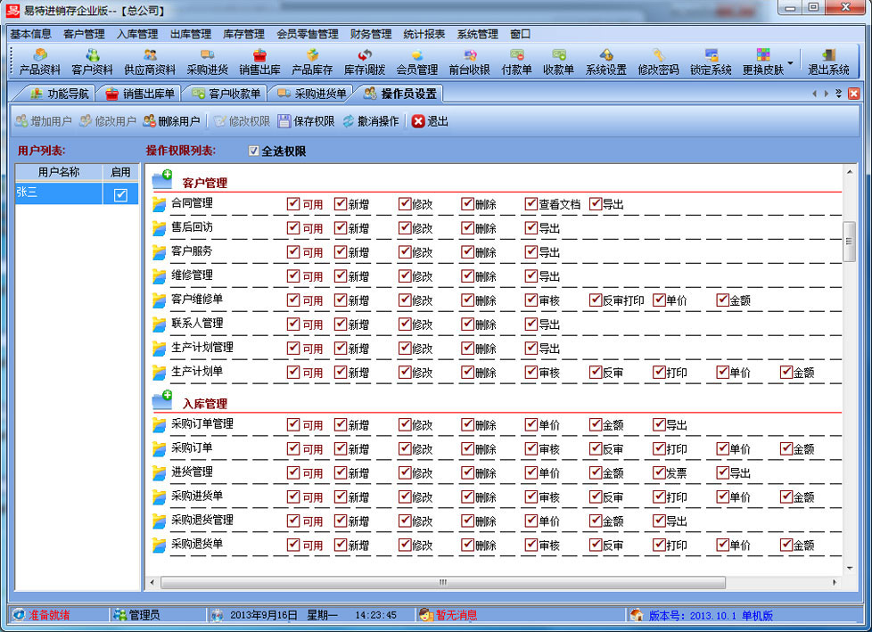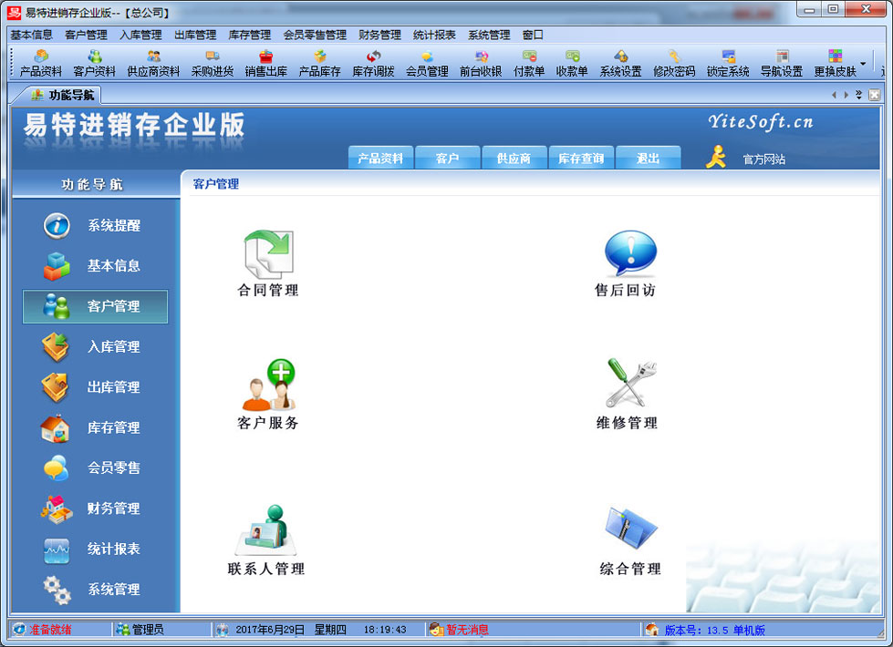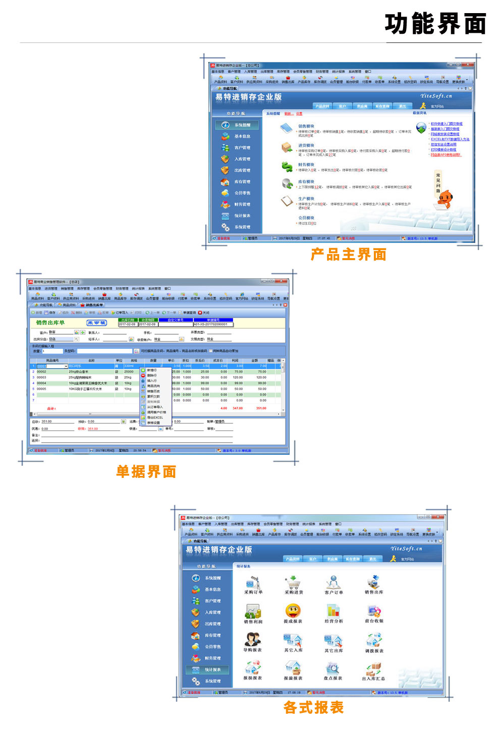易特進銷存企業(yè)版是一款專業(yè)的進銷存管理軟件,其中包含商品銷售管理系統(tǒng) ,庫存管理系統(tǒng)(倉庫管理系統(tǒng)),財務(wù)和報表系統(tǒng)等子模塊。軟件界面設(shè)計簡潔,美觀,其人性化的軟件流程,使普通用戶不需培訓(xùn)也能很快掌握軟件操作使用方法,上手極易。強大報表與集成查詢功能是本軟件的最大特色,所有功能在用戶需要的使用地方自然體現(xiàn),不用打開多個窗口重復(fù)查詢。易特進銷存軟件廣泛適用于企業(yè),商貿(mào)公司,個體門店等用于商業(yè)銷售管理, 庫存管理,財務(wù)管理等,客戶管理,員工管理等場合,是您企業(yè)進行信息化管理的強大工具。 客戶管理:客戶合同、聯(lián)系人,售后服務(wù)及維修管理等。 入庫管理:進行產(chǎn)品采購入庫,采購?fù)素,進貨單據(jù)和退貨單據(jù)查詢,供應(yīng)商往來帳務(wù),供應(yīng)商付款。 出庫管理:銷售出貨,客戶退貨,銷售單據(jù)和客戶退貨查詢,客戶往來帳務(wù),客戶付款。 來料加工:針對客戶提供材料加工產(chǎn)品方式,計算加工費用。 庫存管理:包括庫存之間貨品調(diào)拔,庫存報損、報溢,庫存盤點功能。 拆分組裝:整進散出,或是整出散進等可以自由的拆分組合產(chǎn)品。 財務(wù)管理:預(yù)付款、預(yù)收款,應(yīng)收應(yīng)付款,收入支出,發(fā)票管理。 會員零售:可實現(xiàn)工廠加門店的方式,工廠走銷售流程,門店走會員零售流程。 統(tǒng)計報表:完整的統(tǒng)計查詢功能,每張單據(jù)每次業(yè)務(wù)金額都可以清楚的反映。 權(quán)限管理:可添加刪除系統(tǒng)操作員帳號,強大的權(quán)限控制,可以設(shè)置某用戶對某窗口某個按鈕的權(quán)限。 打印設(shè)計:可對系統(tǒng)內(nèi)每個單據(jù)進行打印的格式設(shè)計,可以導(dǎo)出,導(dǎo)入,每個操作員可設(shè)計自己的打印格式。 界面設(shè)計:系統(tǒng)窗口界面名稱可以自定義設(shè)計,表格的顯示順序,寬度,是否顯示等,每個操作員可以設(shè)計自己的界面。 系統(tǒng)設(shè)置:可以靈活設(shè)置系統(tǒng)小數(shù)位數(shù),可選0-6位,讓帳務(wù)更精確,可對以往數(shù)據(jù)進行選擇性的清除,以便系統(tǒng)初始化。 數(shù)據(jù)備份:可隨時對系統(tǒng)數(shù)據(jù)庫進行安全備份,以防數(shù)據(jù)丟失。 |