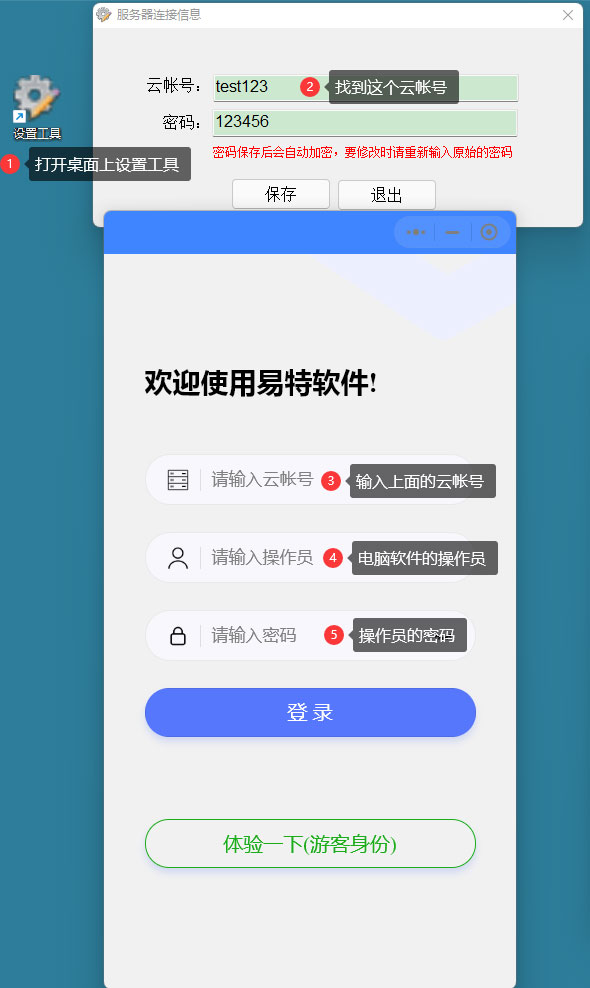 1.先安裝電腦版的軟件,桌面上有一個(gè)設(shè)置工具,打開(kāi)后輸入云帳號(hào)和密碼。 2.打開(kāi)微信小程序,在云帳號(hào)上輸入和設(shè)置工具一樣的帳號(hào)。 3.在操作員這里輸入電腦軟件的操作員,如果是第一次新裝軟件,輸入【管理員】,密碼默認(rèn)為123456,進(jìn)軟件后請(qǐng)修改密碼。 4.如果有多個(gè)操作員,進(jìn)軟件后,在軟件上【系統(tǒng)管理】--【操作員設(shè)置】,新增用戶,可以添加多個(gè)操作員帳號(hào),電腦和小程序都可以登陸這個(gè)帳號(hào) |