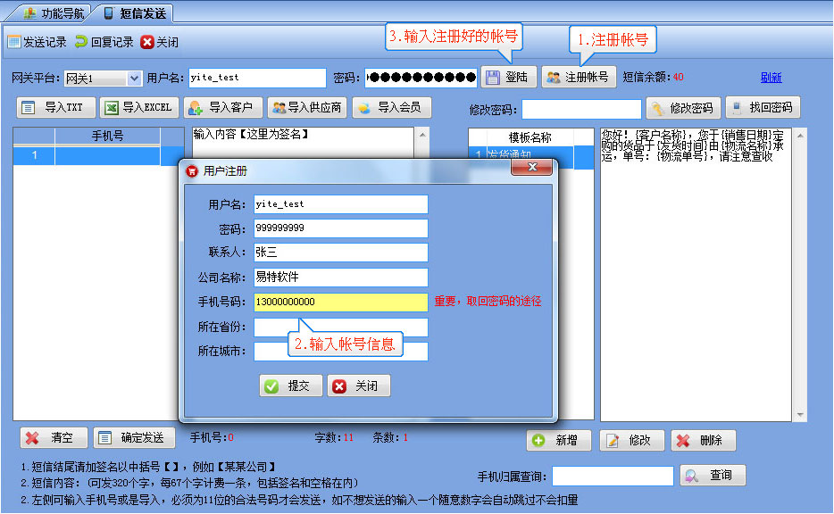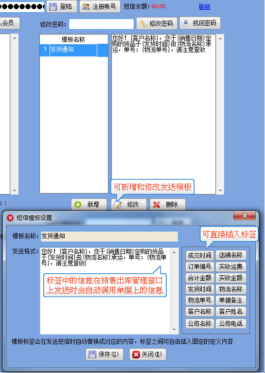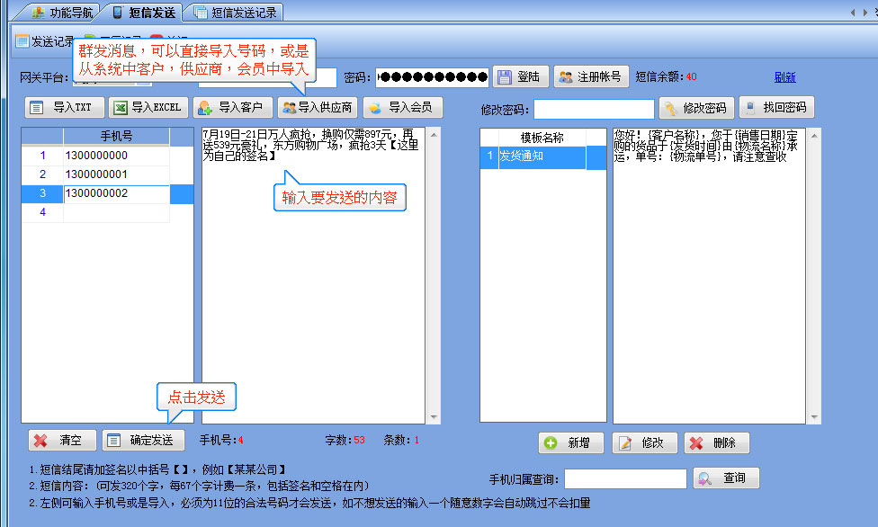 短信發(fā)送流程 1.【系統(tǒng)管理】-----【短信發(fā)送】-----打開如圖所示,注冊好帳號和密碼,然后輸入在界面上并點(diǎn)登陸,成功后會顯示短信余額為0 2.需要群發(fā)時直接可以導(dǎo)入已有的EXCEL表格,或是TXT格式的手機(jī)號,也可以從系統(tǒng)中將客戶或供應(yīng)商等手機(jī)號直接導(dǎo)入后發(fā)送 3.發(fā)貨通知消息,可在客戶訂單管理及銷售出庫管理窗口上直接將當(dāng)前單據(jù)的信息發(fā)給對應(yīng)的客戶。 |