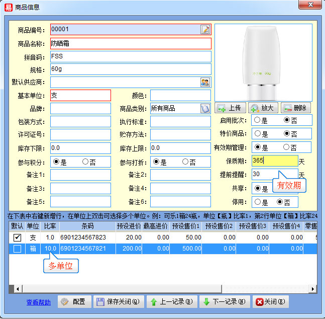 提供商品編號(hào)、名稱(chēng)、規(guī)格、品牌、有效期等設(shè)置 |