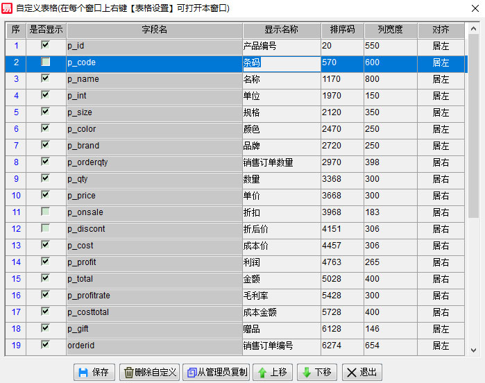 支持自定義字段名稱、顯示/隱藏、對齊方式;
